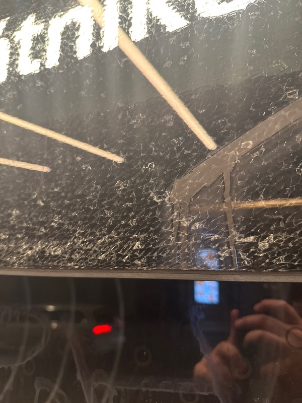 Rozbitá část skla na zastávce U památníku směr do centra.