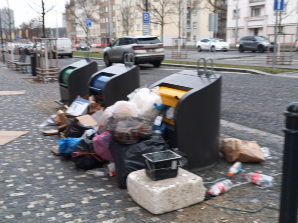 Již více než týden je velký nepořádek u kontejnerů u nových domů v ulici Jana Želivského.