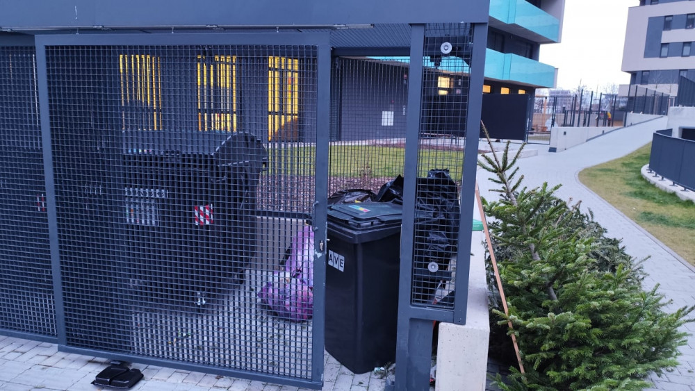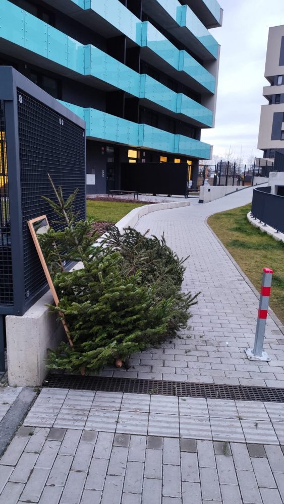 Vánoční stromky u popelnic. Otevřené koje a bordel u popelnic.