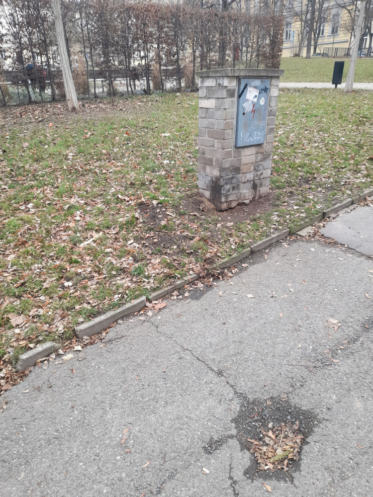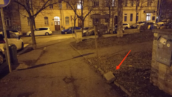 Na náměstí Barikád se u okraje chodníku nachází pohozený nadbytečný kamenný kvádřík.
