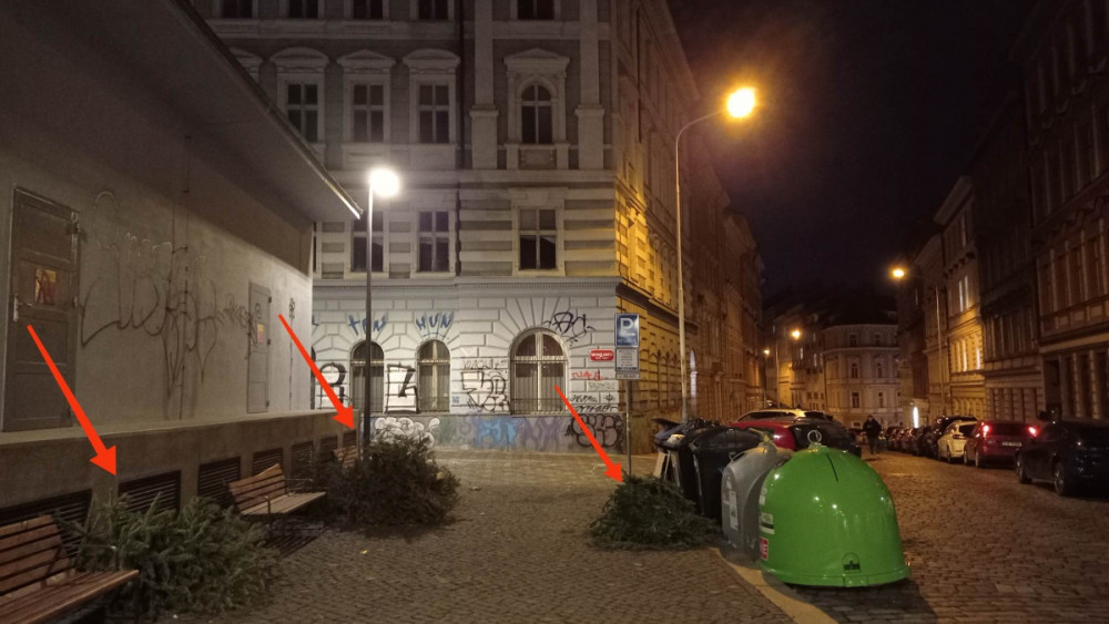 Na Kostnickém náměstí se u ulice Orebitská nachází u kontejnerů na tříděný odpad odložené větší množství vánočních stromků.
