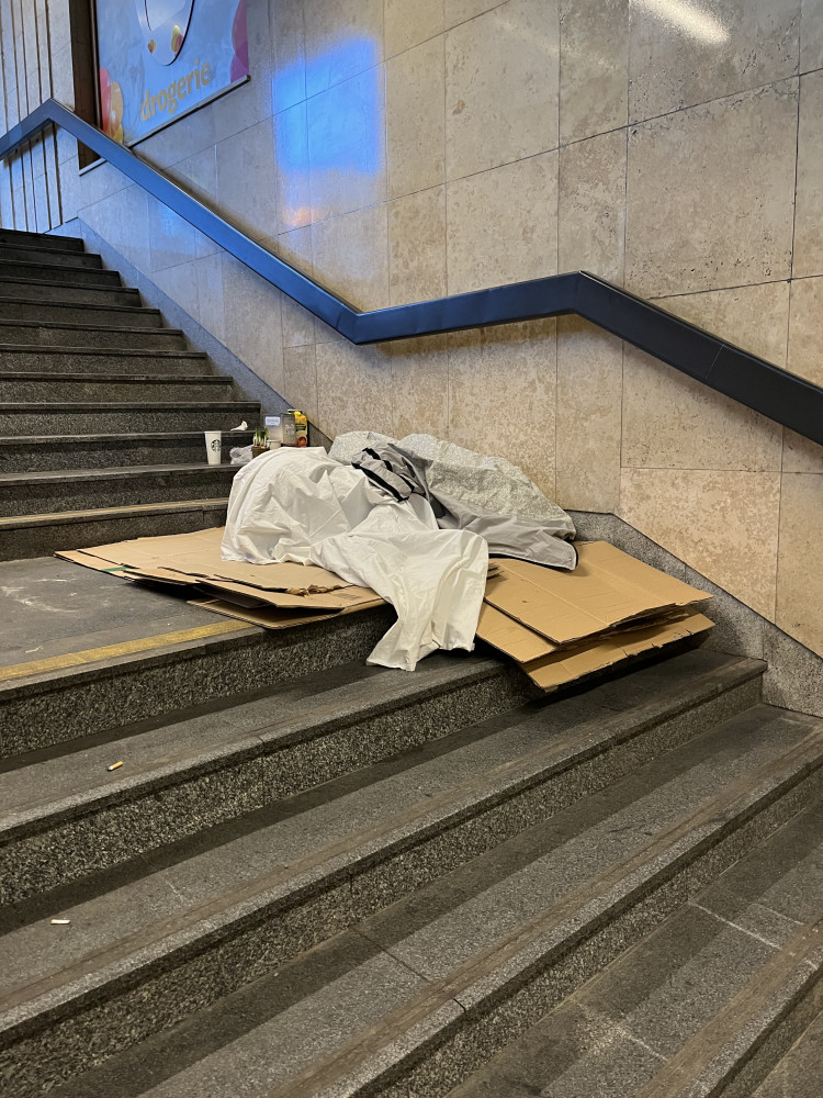 Zas a znovu bezdomovci v metru. Člověk už se tudy bojí chodit. Několik lidí se otočilo a raději šlo jiným vchodem.