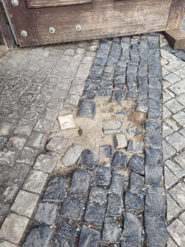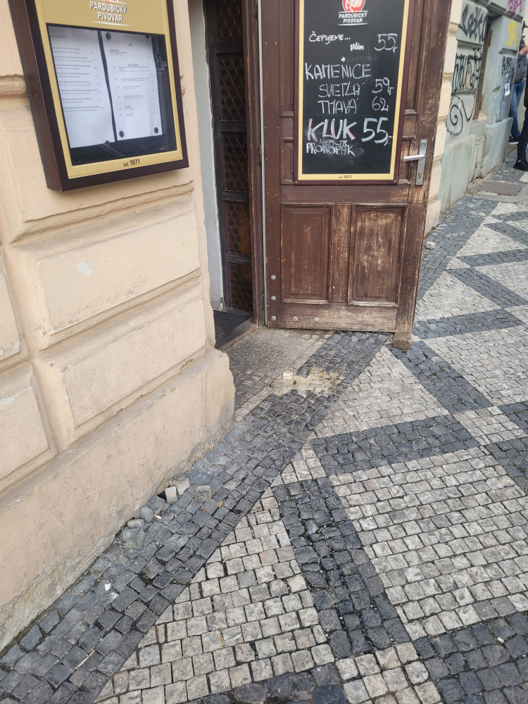 Dobry den. U vstupu do podniku Pivnice U Jary je poskozeny chodnik. Lide nasledne botama kopky vykopavaji po okoli a do daneho podniku.