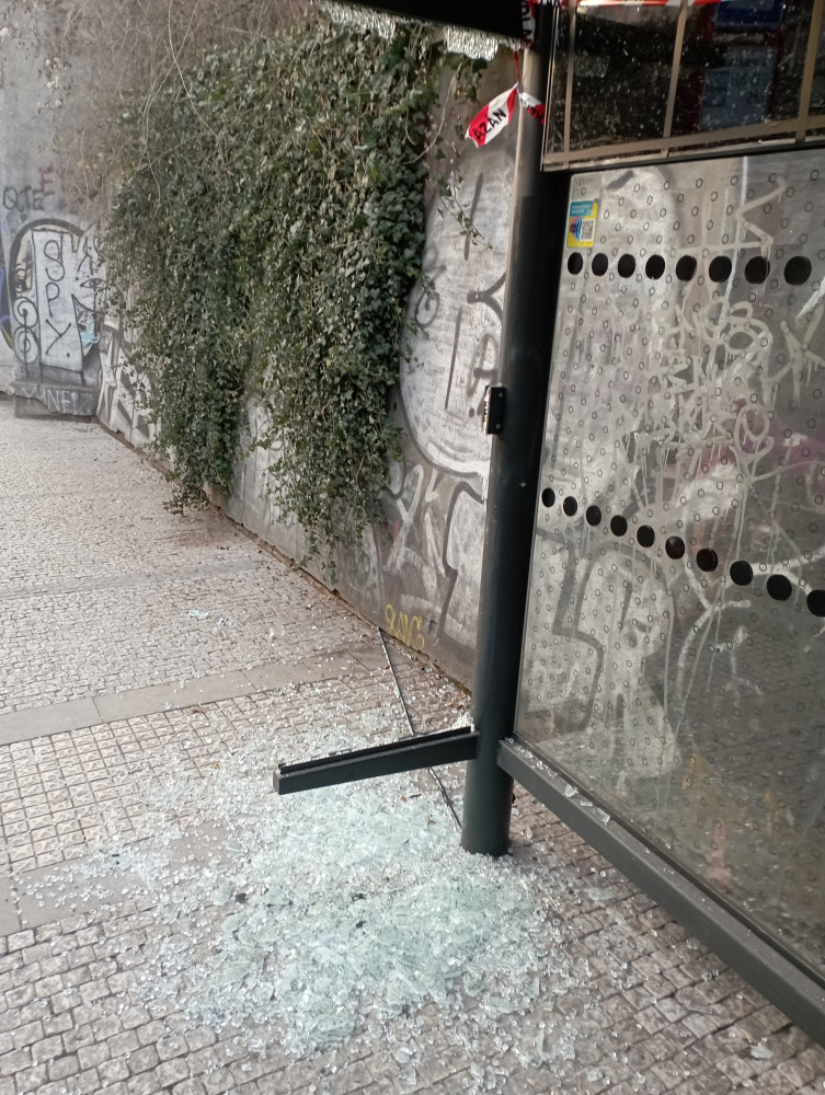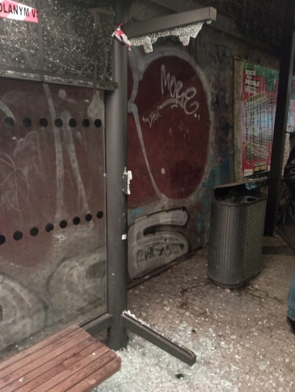 Vytlučené skleněné výplně- zastávka U památníku v Husitské ulici směr do centra