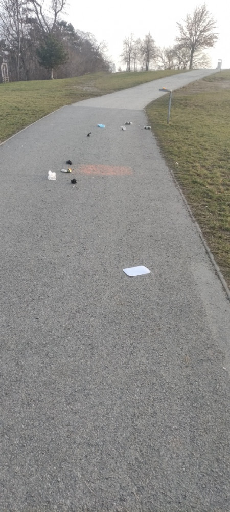 Na parukářce u hlavni cesty kolem velkého hřiště na kopec k totemu nekdo vyrval kose ze stojanu a rozhazel odpadky