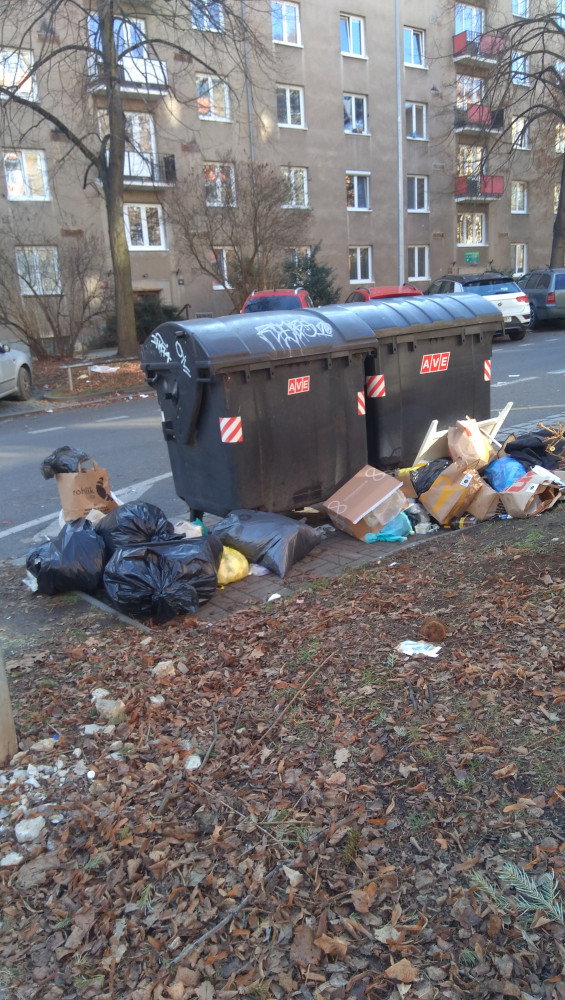 Dobrý den, za pořádek okolo popelnice je odpovědný vlastník nádoby. V případě popelnic na směsný odpad ( černé nádoby ) to bývá zpravidla majitel přilehlého domu, jehož adresa je vylepena na popelnici. -V podobných případech se obracejte přímo na něho, případně na hygienickou stanici, nebo na policii... Děkujeme za pochopení Marek Čistá Trojka