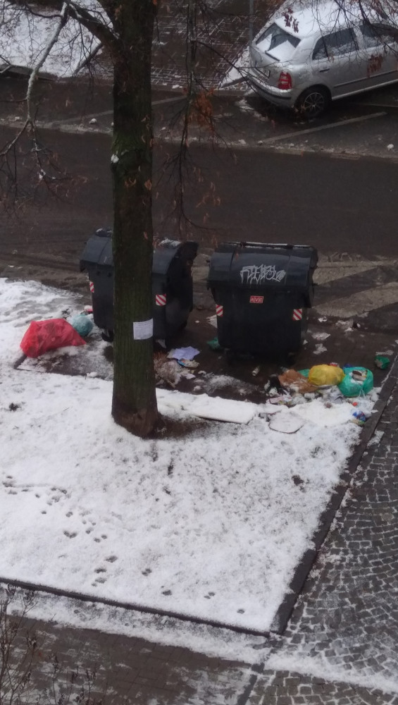 Dobrý den, za pořádek okolo popelnice je odpovědný vlastník nádoby. V případě popelnic na směsný odpad ( černé nádoby ) to bývá zpravidla majitel přilehlého domu, jehož adresa je vylepena na popelnici. -V podobných případech se obracejte přímo na něho, případně na hygienickou stanici, nebo na policii... Děkujeme za pochopení Marek Čistá Trojka