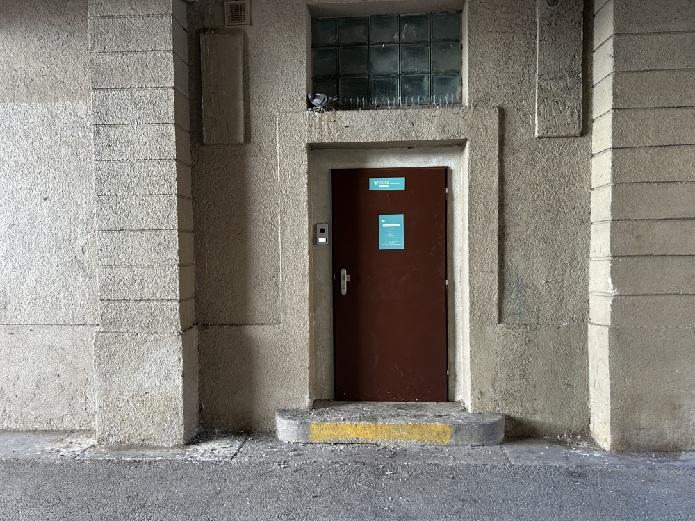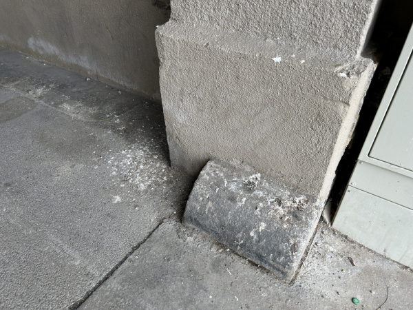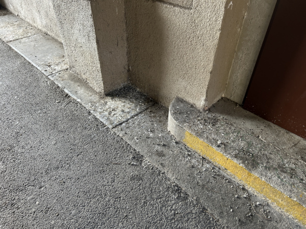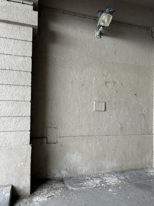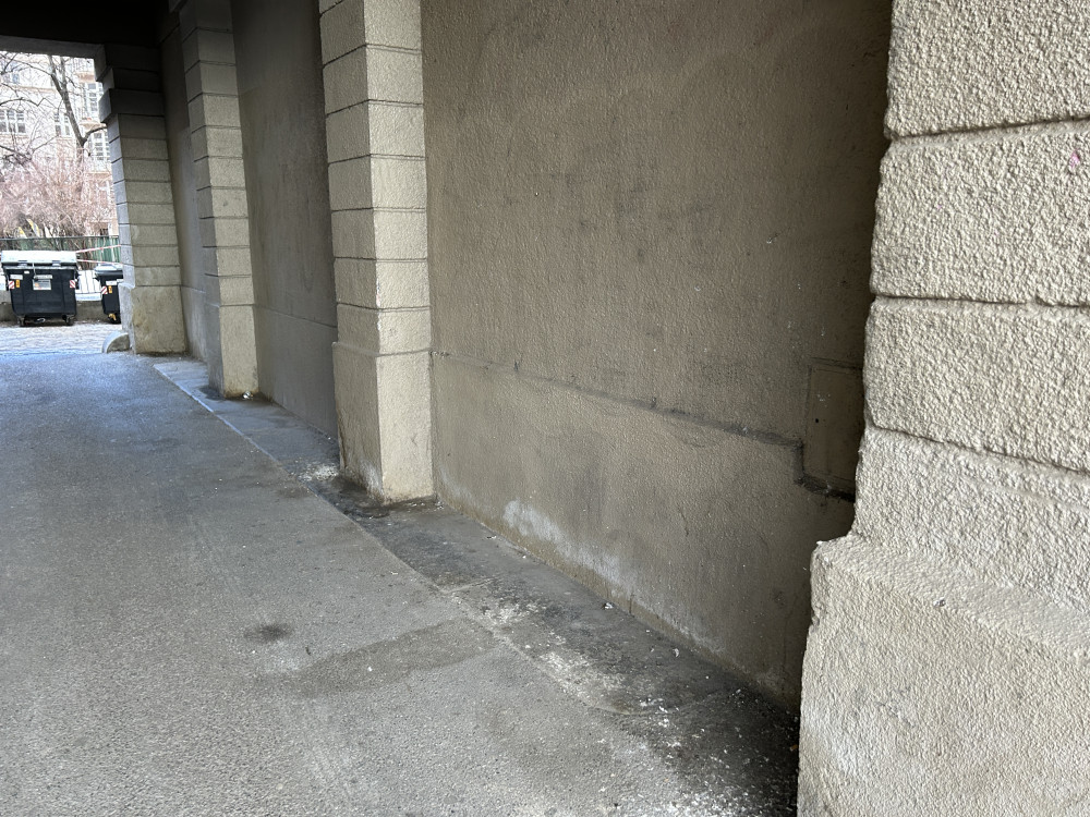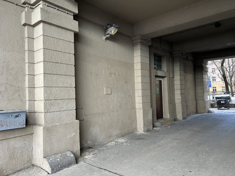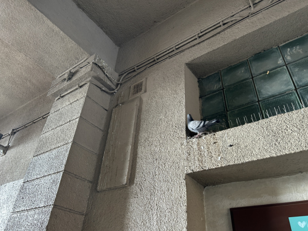 Holubi a holubí trus v podchodu Jeseniova 101.