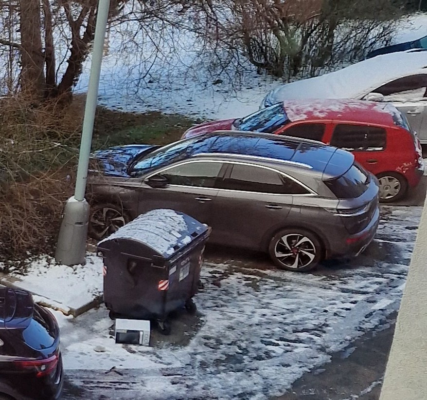 U kontejneru na odpad někdo vyhodil mikrovlnou troubu. Kunešova 2649/10, Praha 3