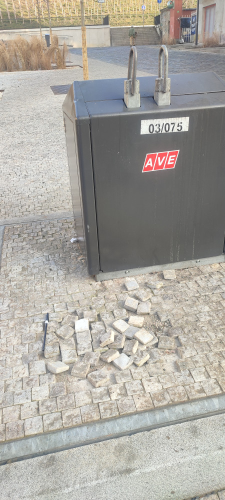 Uvolněné dlažební kostky u kontejneru na tříděný odpad