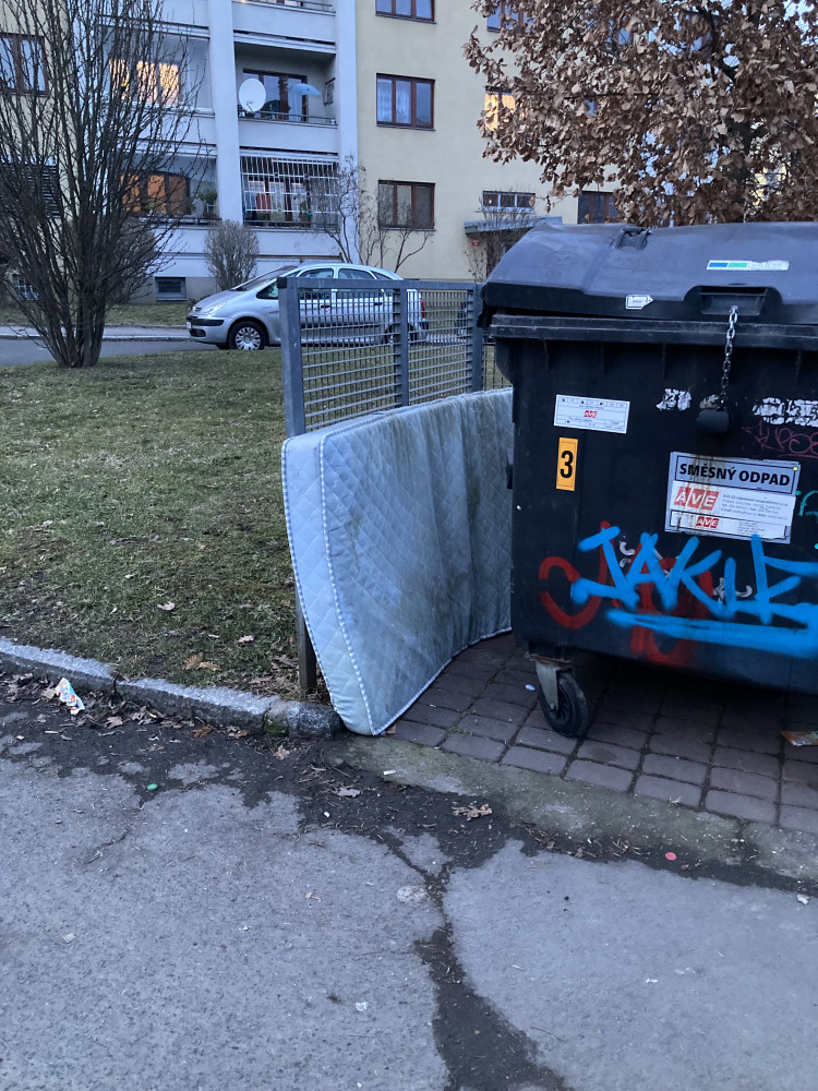 Matrace u kontejneru, popeláři jí neodvezou. Nevíme, kdo jí tam dal. Prosíme o odvoz. Děkujeme