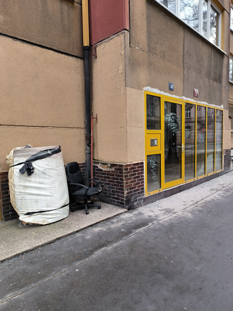 Vedle vchodu do domu Rokycanova 652/30 odložená kancelářská židle a matrace.