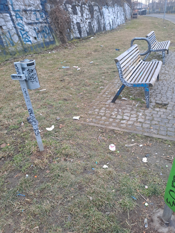 Haldy odpadků na cyklostezce ve stráni ohraničené mosty přes Seifertovu a Husitskou.