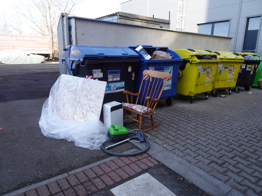 Dobry den, u kontejenru na trideny odpad v ulici Zverinova je vyhozeny stary nabyte, vysavat atd. Prosim o uklid.