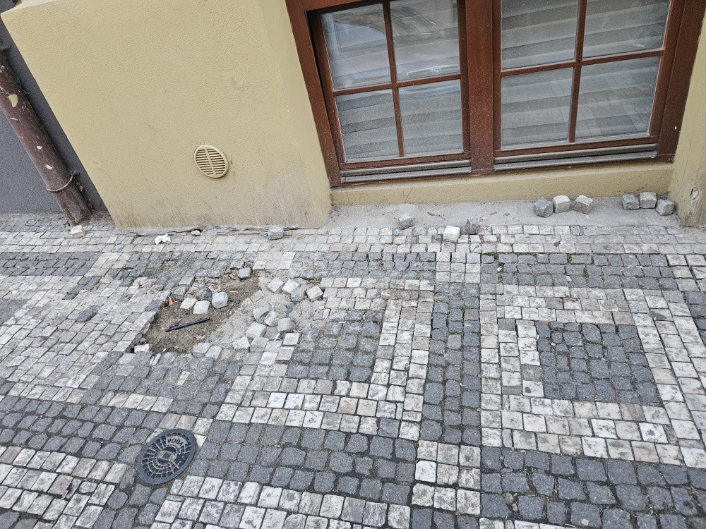 Vypadane kostky z dlažby chodniku. Krásova 35