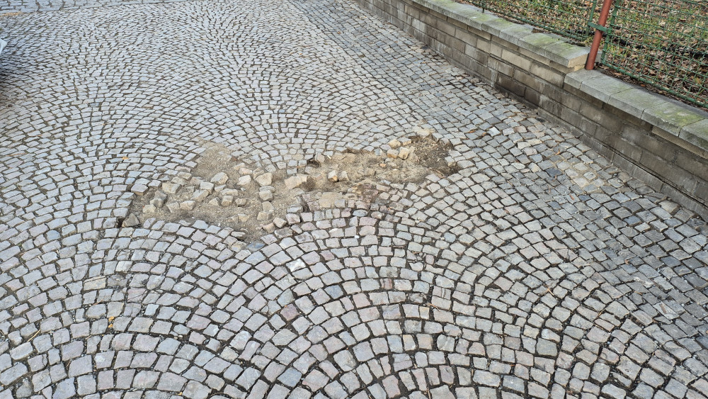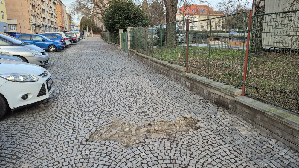 Chybějící dlažba na chodníku v ulici Jeseniova (před bývalou školkou). Dlažební kostky byly asi ukradeny, díra se totiž objevila ze dne na den a kostky nejsou ani nikde rozházené v okolí.
