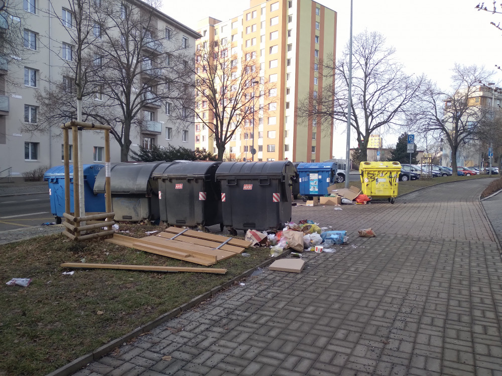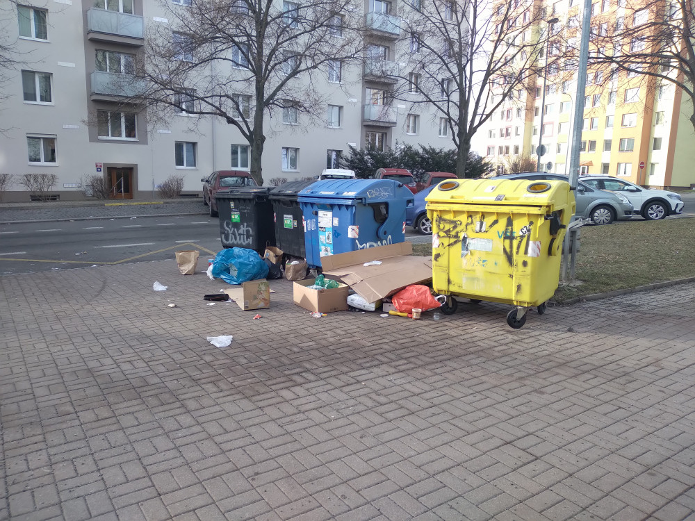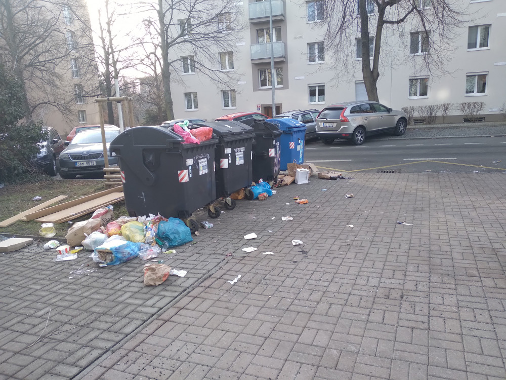 děkujeme za Váš podnět. Za pořádek okolo popelnic/kontejnerů je odpovědný jejich vlastník. V případě černých popelnic/kontejnerů na směsný odpad to bývá zpravidla majitel přilehlého domu (adresa domu by měla být uvedena na nálepce na popelnici). V podobných případech se obracejte přímo na majitele domu, příp. na hygienickou stanici nebo na policii. Děkujeme za pochopení.