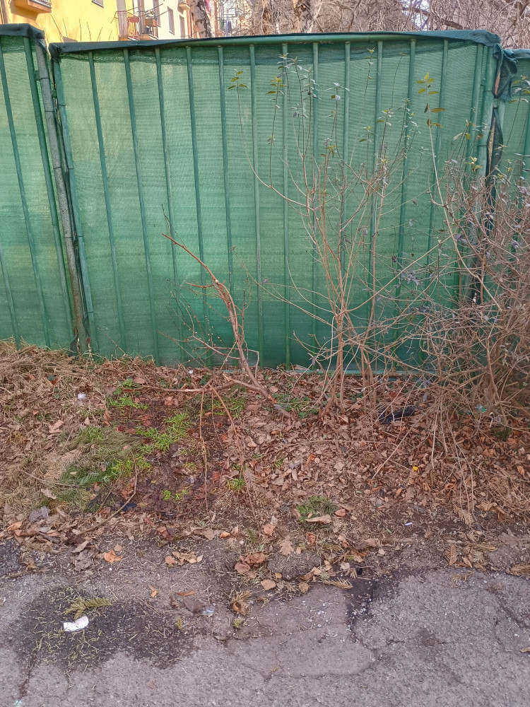 matrace a vánoční stromek, za stáním na popelnice (mezi keři , špatně viditelné z auta)