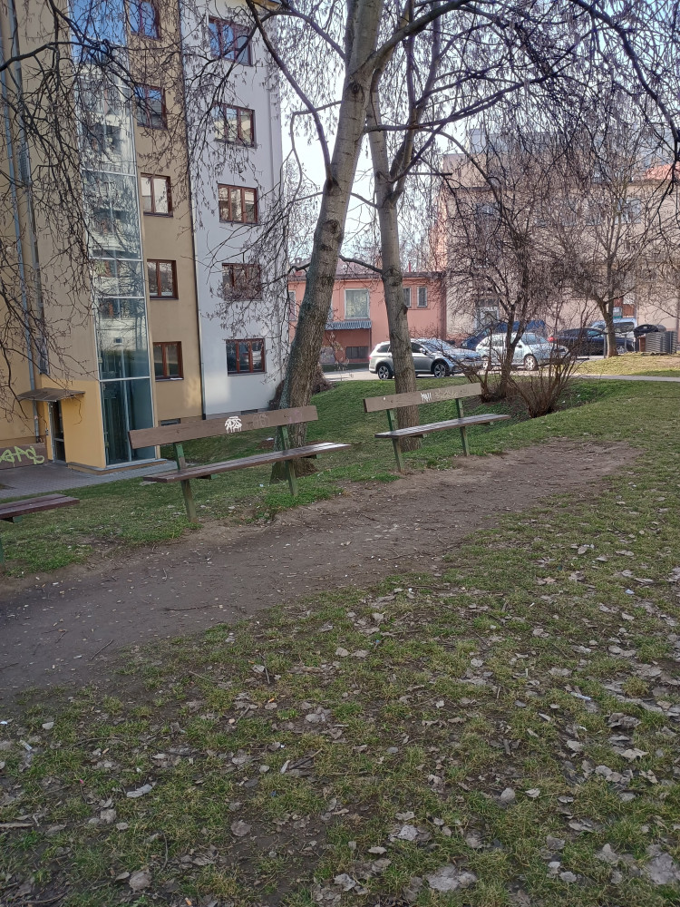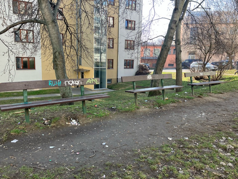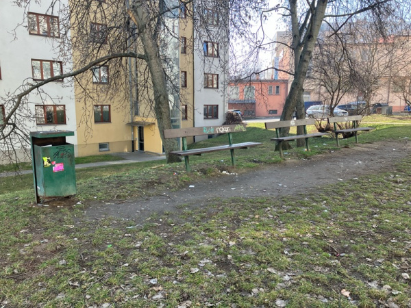 Nepořádek kolem laviček za domem K Chmelnici 3,5,7 Praha 3