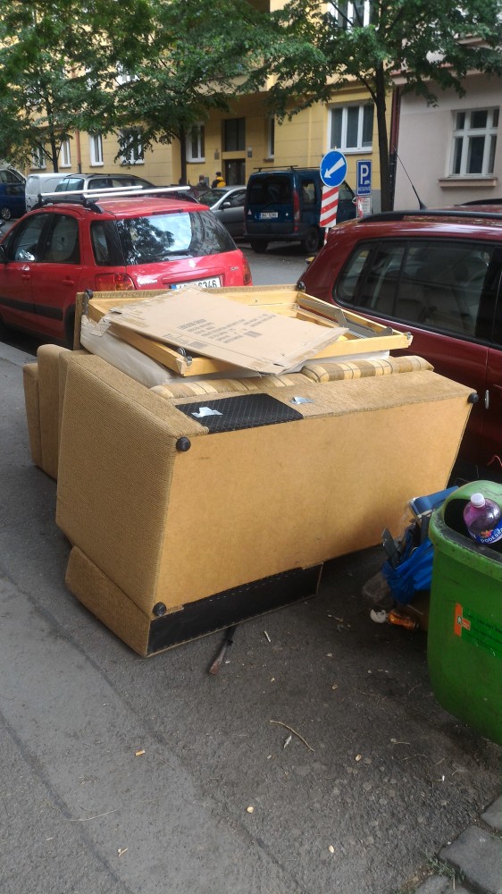 Odložená postarší sofa s křeslem na rohu Biskupcovy a J. Želivského.