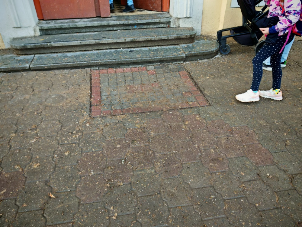 Exkrementy od holubu pred vchodem ZŠ Žerotínova. Problém se opakuje, bylo by potreba resit opatrení na budove, aby se zabránilo prístupu holubum na strechu, rímsy.