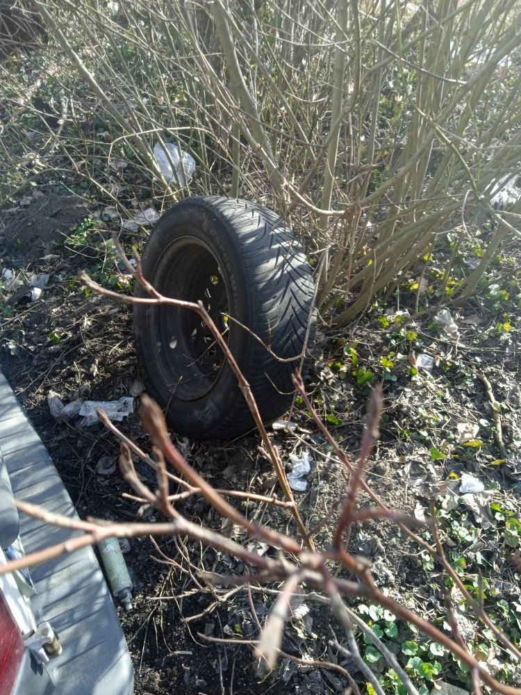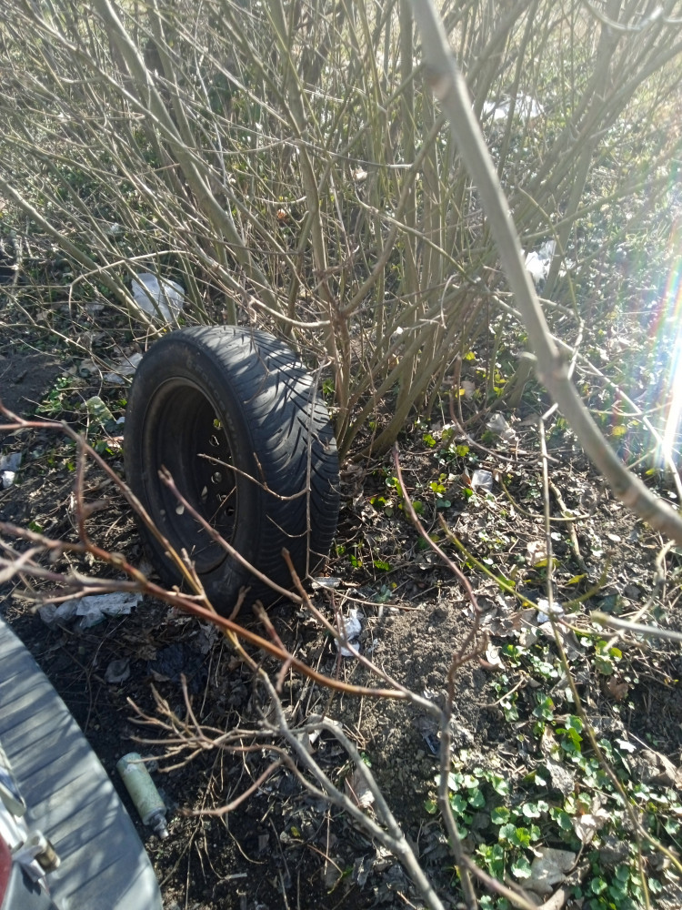 Vyhozený kolo s pneu na parkovišti u bývalé benzínové pumpy Pap oil habrová 2a Praha 3 Žižkov a nepořádek u křoví