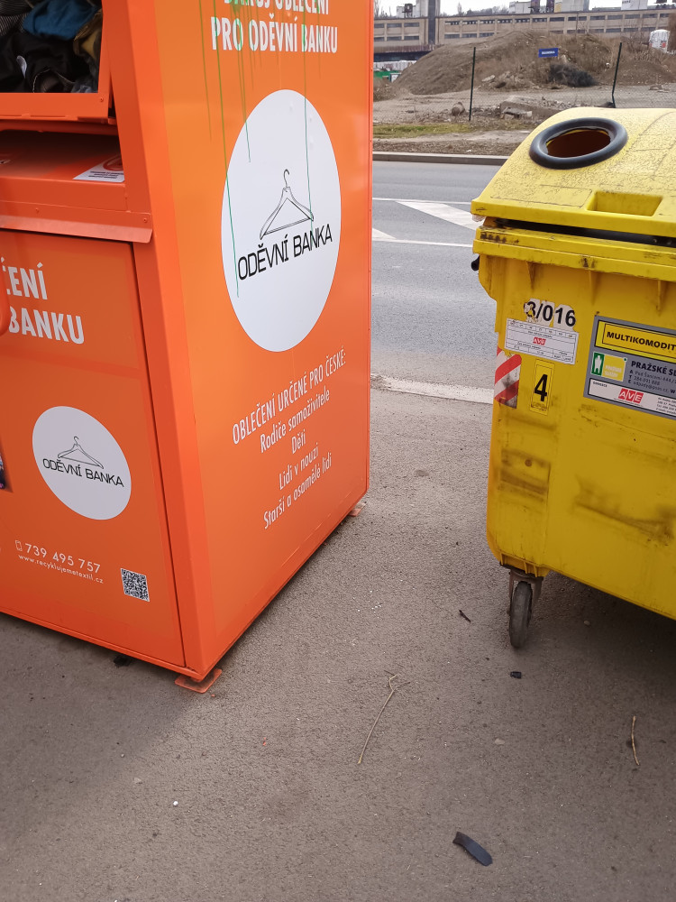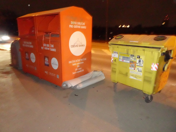 Dobry den, v ulici Malesicka u NAREXU je kontejenr na obleceni. Vedle nej je vyhozen stary koberece.