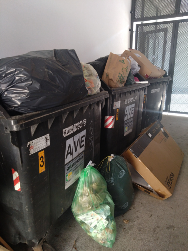 děkujeme za Váš podnět. Ze zaslaných fotografií to vypadá, že nepořádek kolem popelnic/kontejnerů je uvnitř uzamykatelného kontejnerového stání, do kterého nemáme přístup. Nepořádek proto bohužel nemůžeme uklidit a odvézt.