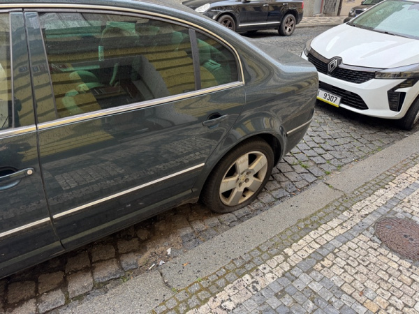 Nepojizdne auto, stoji tu pres rok. Vyfoukle pneumatiky, kolem roste trava.