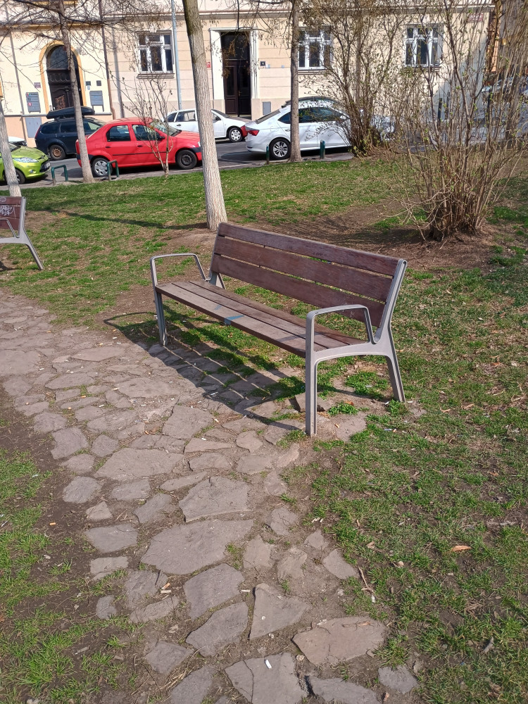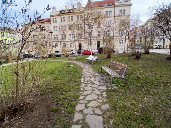 nám. Barikad - peřiny na lavičce a u stromu dveře