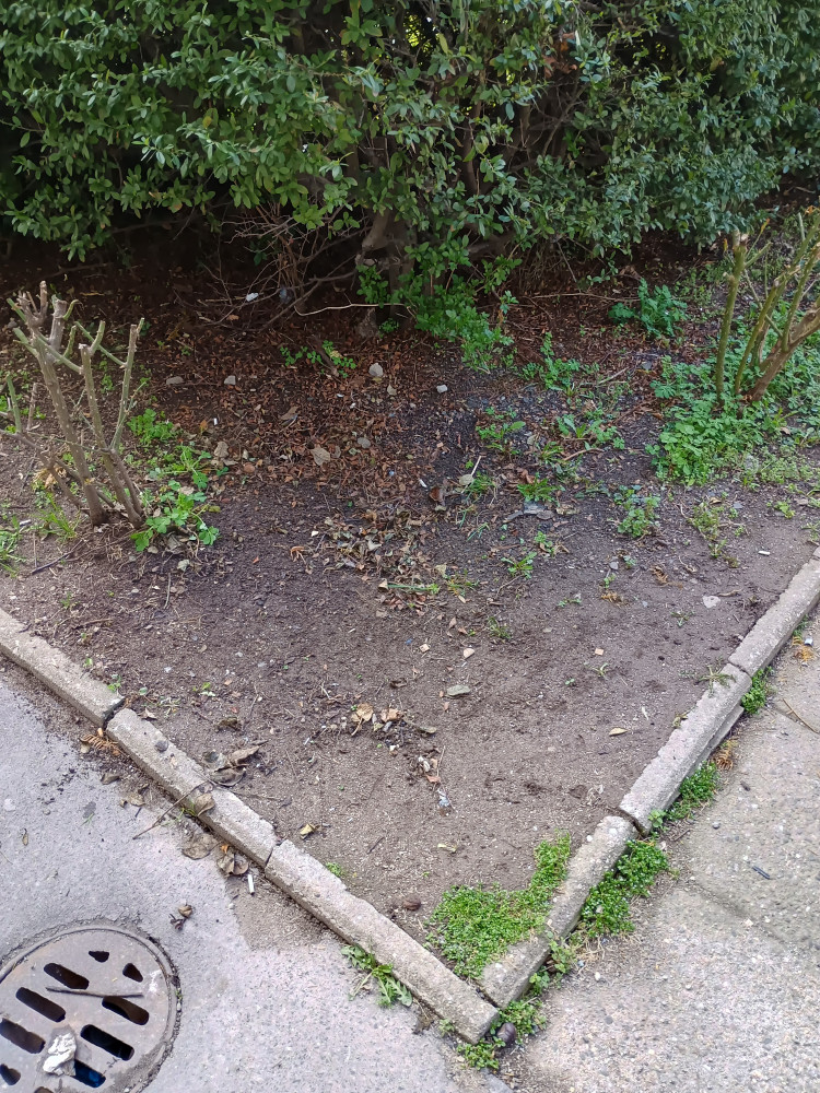Neuklizene vetve po strihani ruzi - primo pred zadnim vchodem (na zahonu) do domu Křivá 1. Děkuji