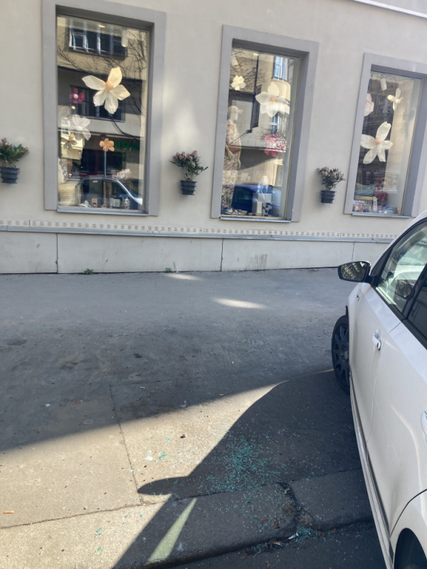 Doplňujeme předchozí odpověď. Byli jsme dnes znovu na místě, ale přes sklo je stále zaparkované auto (viz foto) a střepy nelze zamést. Bohužel nejsme proto schopni tento problém nyní vyřešit. Střepy bude nutné zamést během jarního komplexního čištění ulic, které postupně probíhá na Praze 3 od začátku dubna.