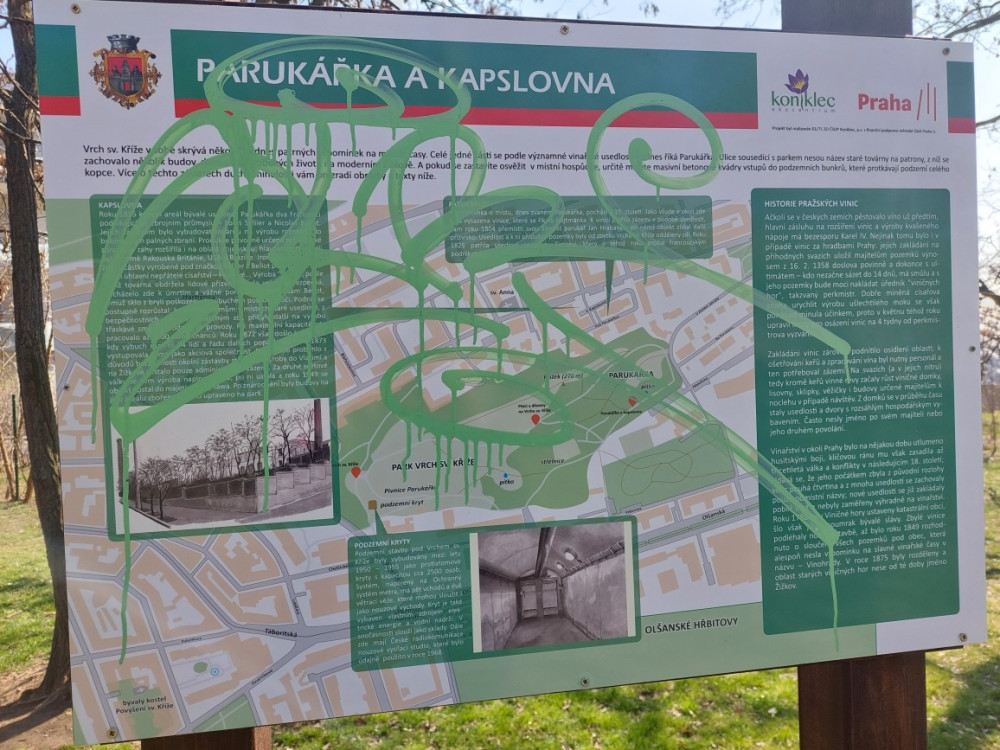 na Parukářce někdo posprejoval nedávno umístěnou info tabuli.
