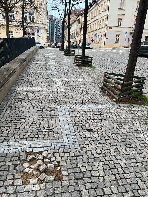 Dlažba, vy trhaná, nebezpečná hned před radnicí.
