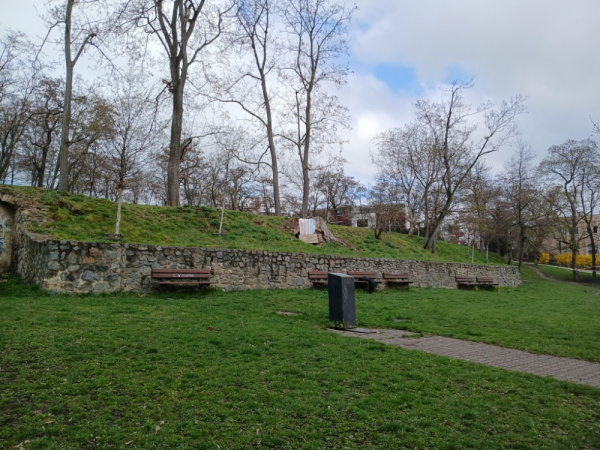 Vrch sv. Kříže - bezdomovecke leženi v tunelu nad pítkem