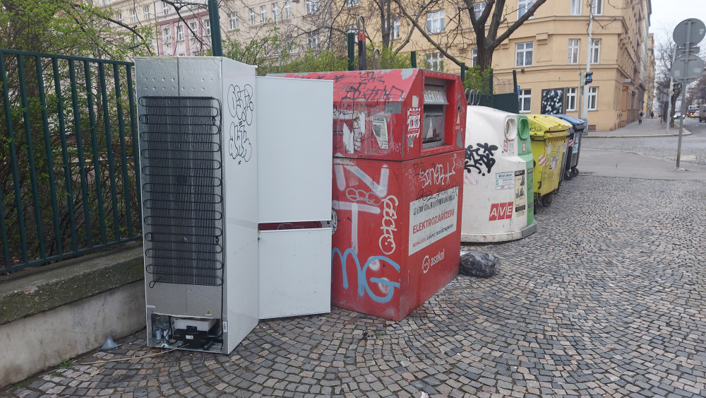Hlásím že před domem Boleslavská 2183 (roh Boleslavská a Slezská) je od soboty 29.3. odložena stará lednice (viz fota).