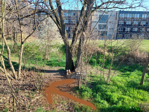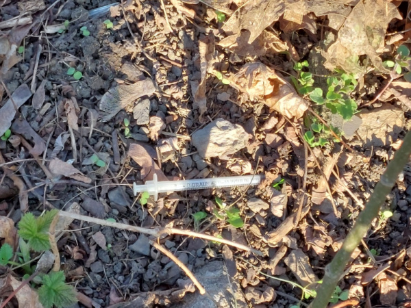 v parku pod SK Žižkov v terénní prohlubni, kde spávali bezdomovci je injekční stříkačka.