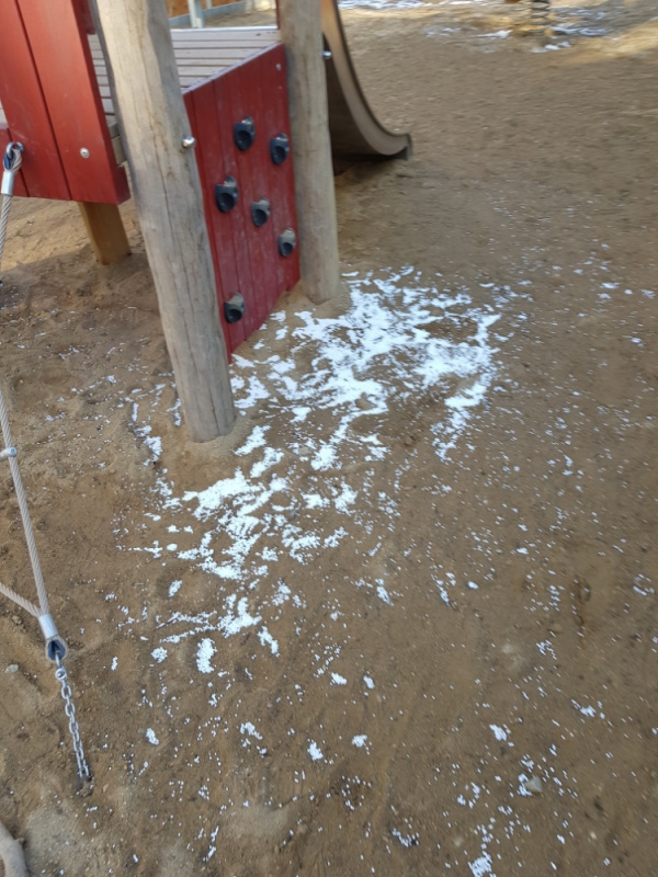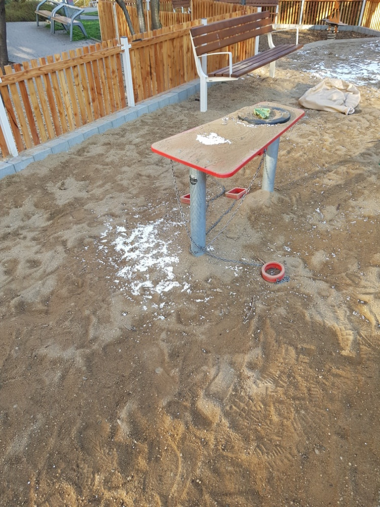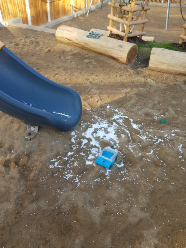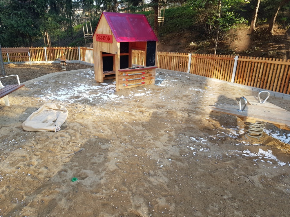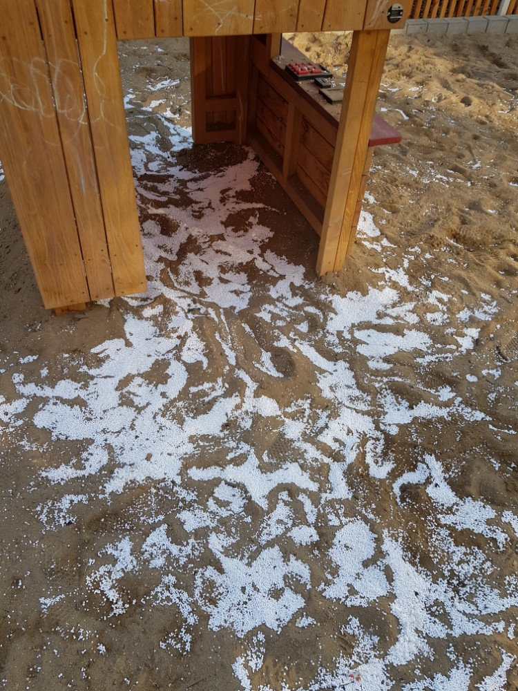 Rozsypane kulicky polystyrenu na detskem hristi Lupacova.