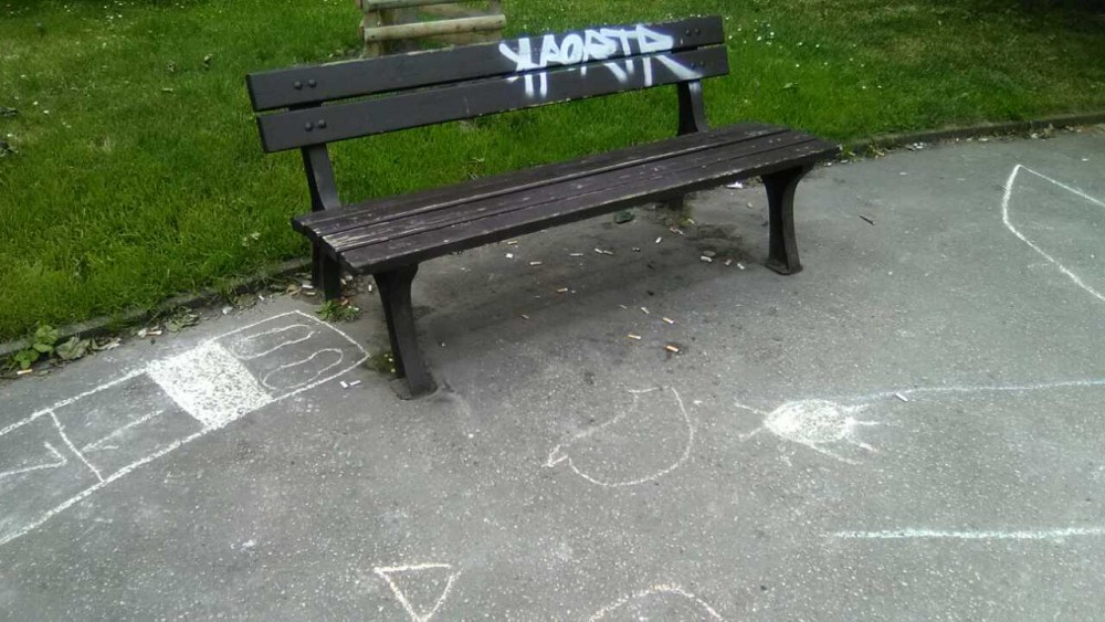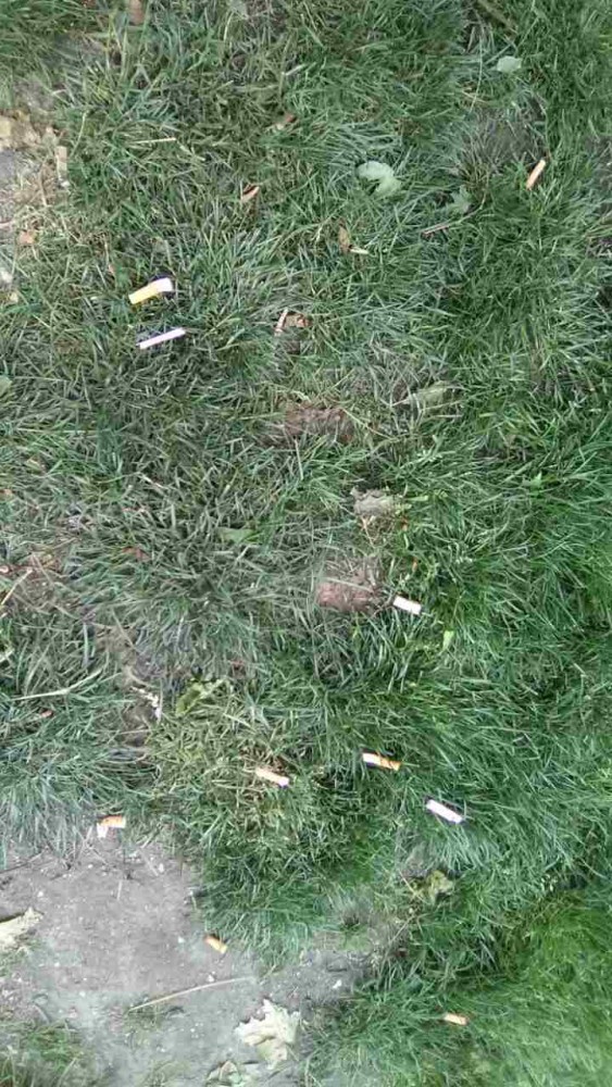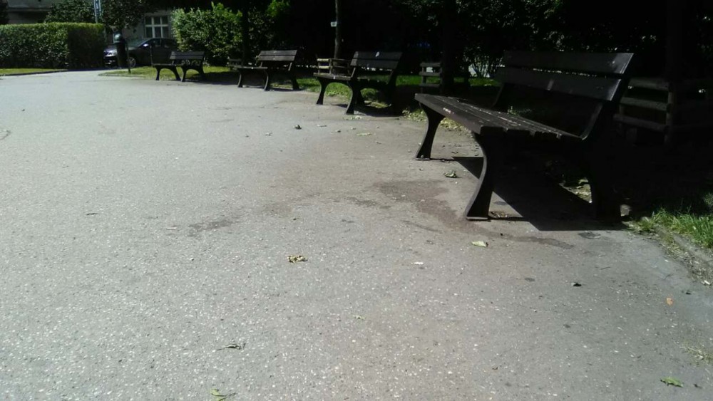 Škroupovo nám.: prosím uklidit odpadky - vnitřní zelený pruh a zamést kolem a pod lavičkami - nedopalky cigaret.