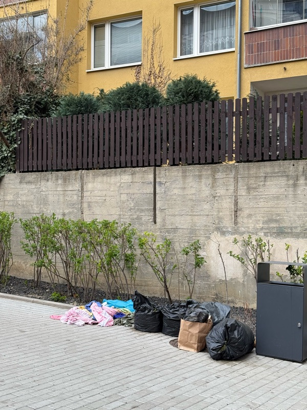 Pytle s vyhazenymi hadry v parku u sberne nadoby.