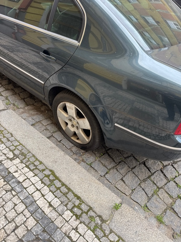 Vrak, vyfouknuta kola, stoji tu pres rok na stejnem miste, kolem roste trava.