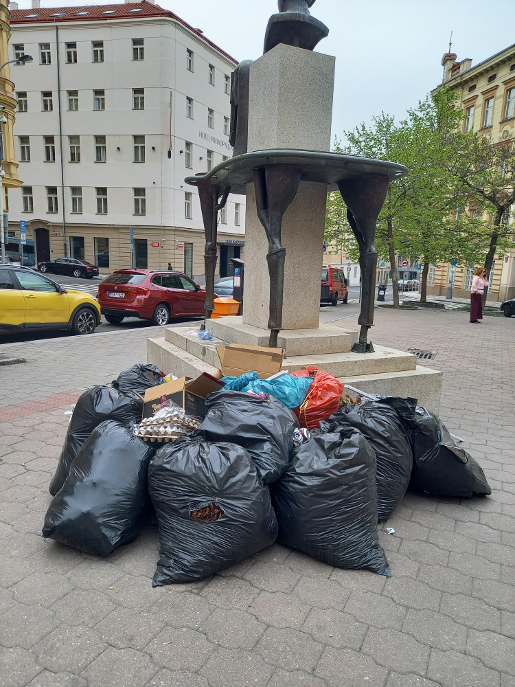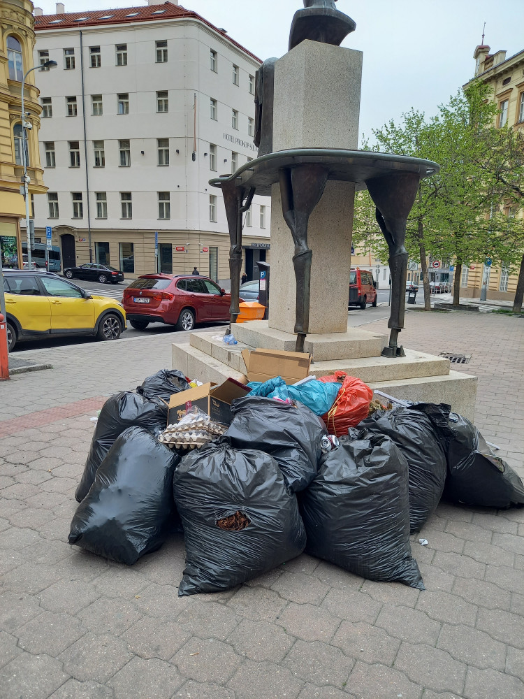 Odložené pytle s odpadky u sochy na Prokopově náměstí