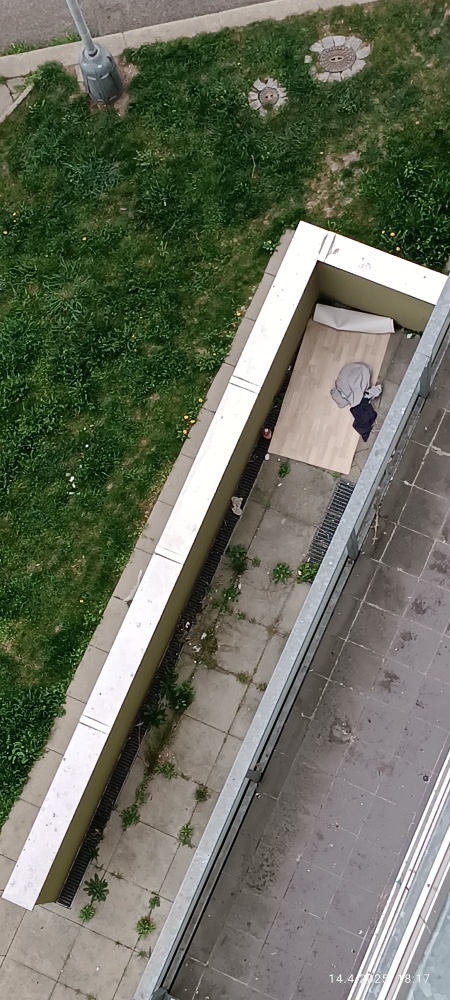 opět se ve slepém místě za zídkou ubytoval bezdomovec