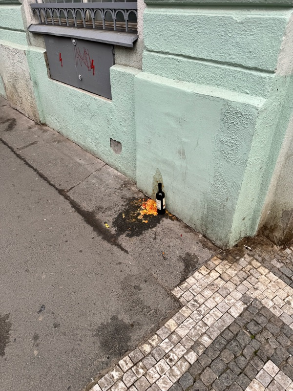 V ulici Bořivojova na rohu, kde se kříží Vita Nejedlého je láhev vína ve zvratcích.