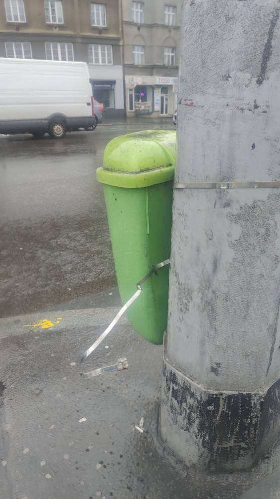 utržený ocelový pásek držící koš na odpadky, velmi nebezpečné pro starší lidi a nevidomé, křižovatka Ohrada