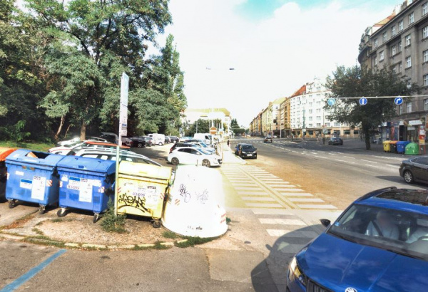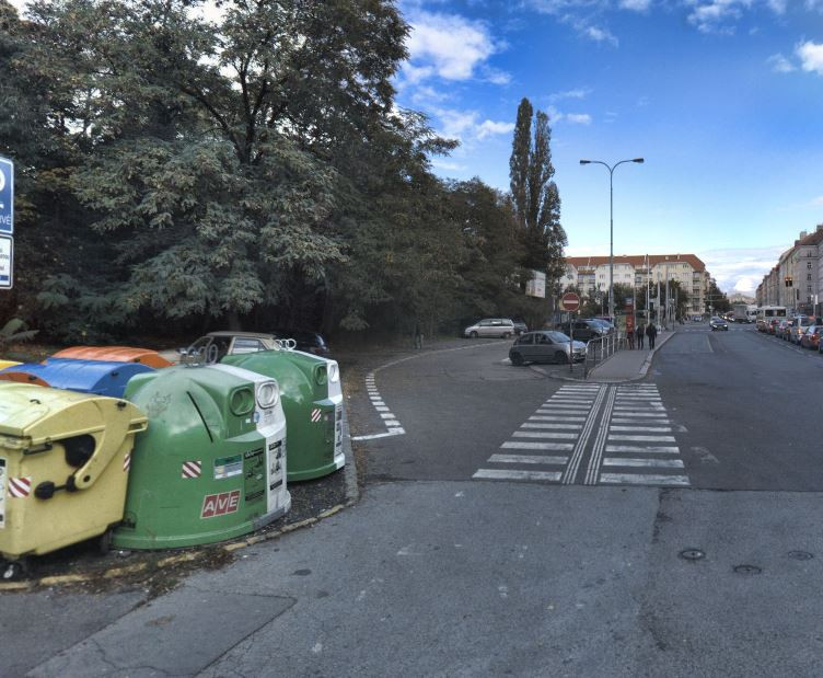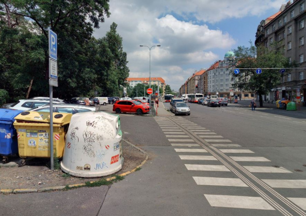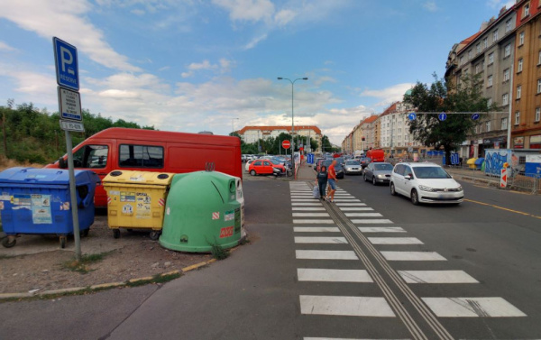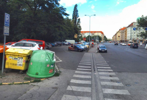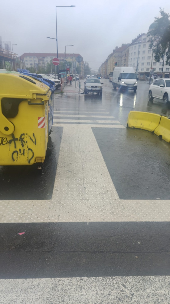 omezený průchod na přechodu pro chodce kvůli konetjnerům tříděný odpad, opět nebezpečné pro nevidomé, naproti domu Hartigova 110