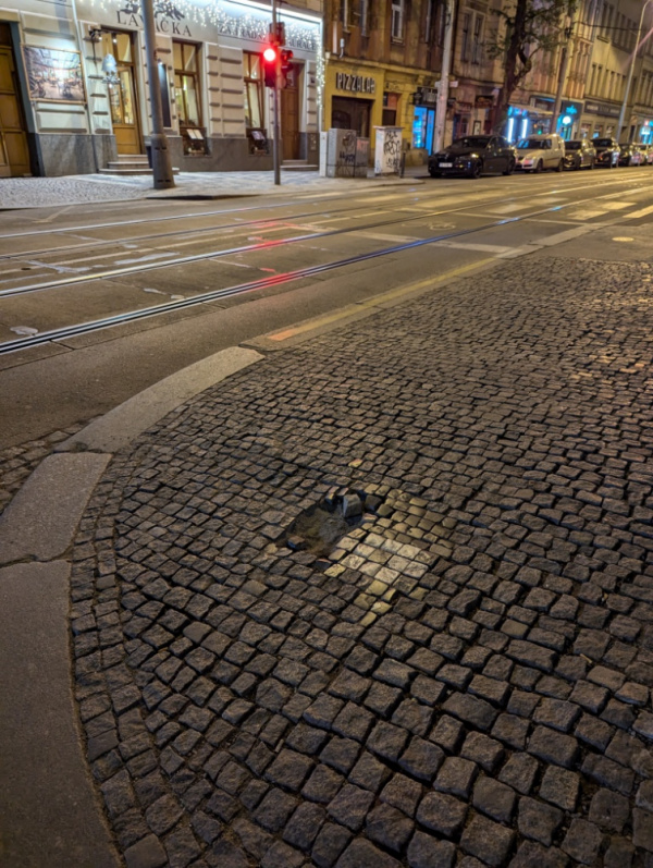 Chybějící dlažební kostky v chodníku a postupný rozpad dalších částí. Na rohu Sladkovského náměstí a Seifertovy ulice.