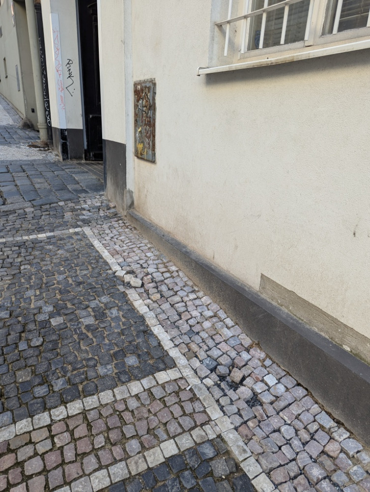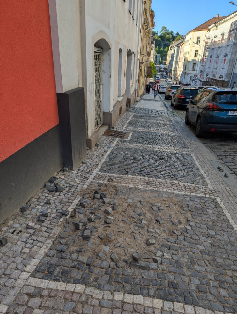 Chybějící dlažební kostky v chodníku na více místech poblíž sebe a postupný rozpad dalších částí před domem Chlumova 13.