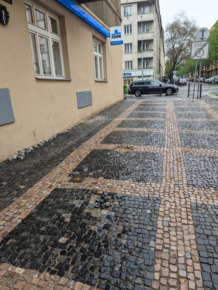 Chybějící dlažební kostky v chodníku, které se povalují okolo, postupný rozpad dalších částí chodníku před domem Biskupcova 7.