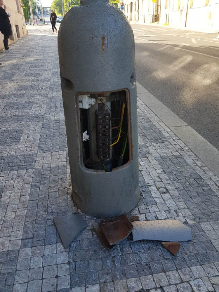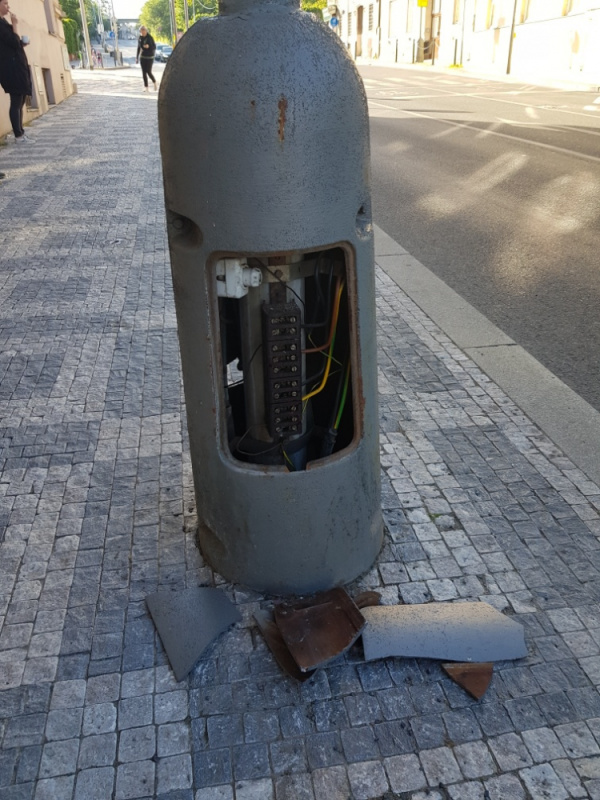 poskozena zakladna sloupu verejneho osvetleni, obnazene vodice pod napetim.